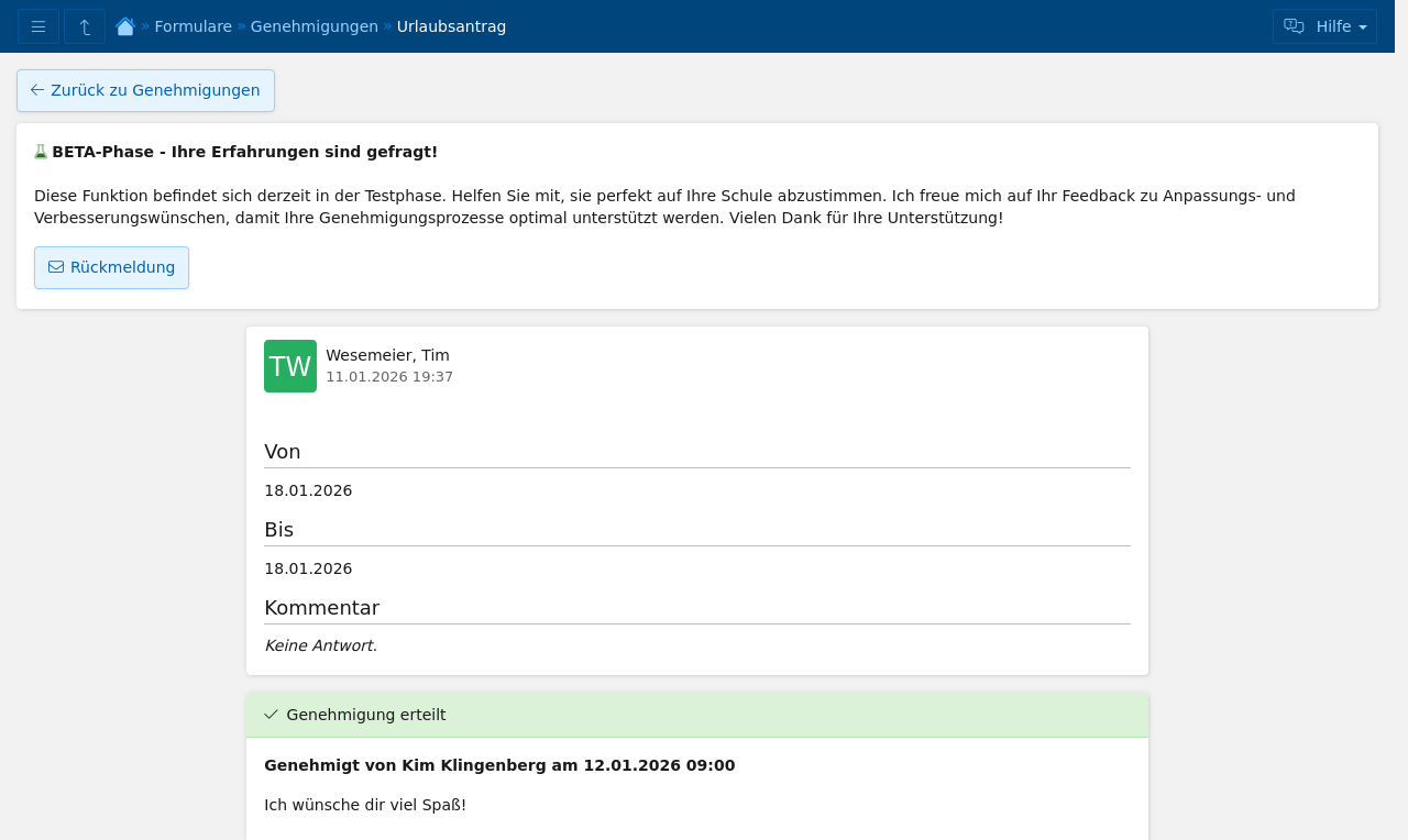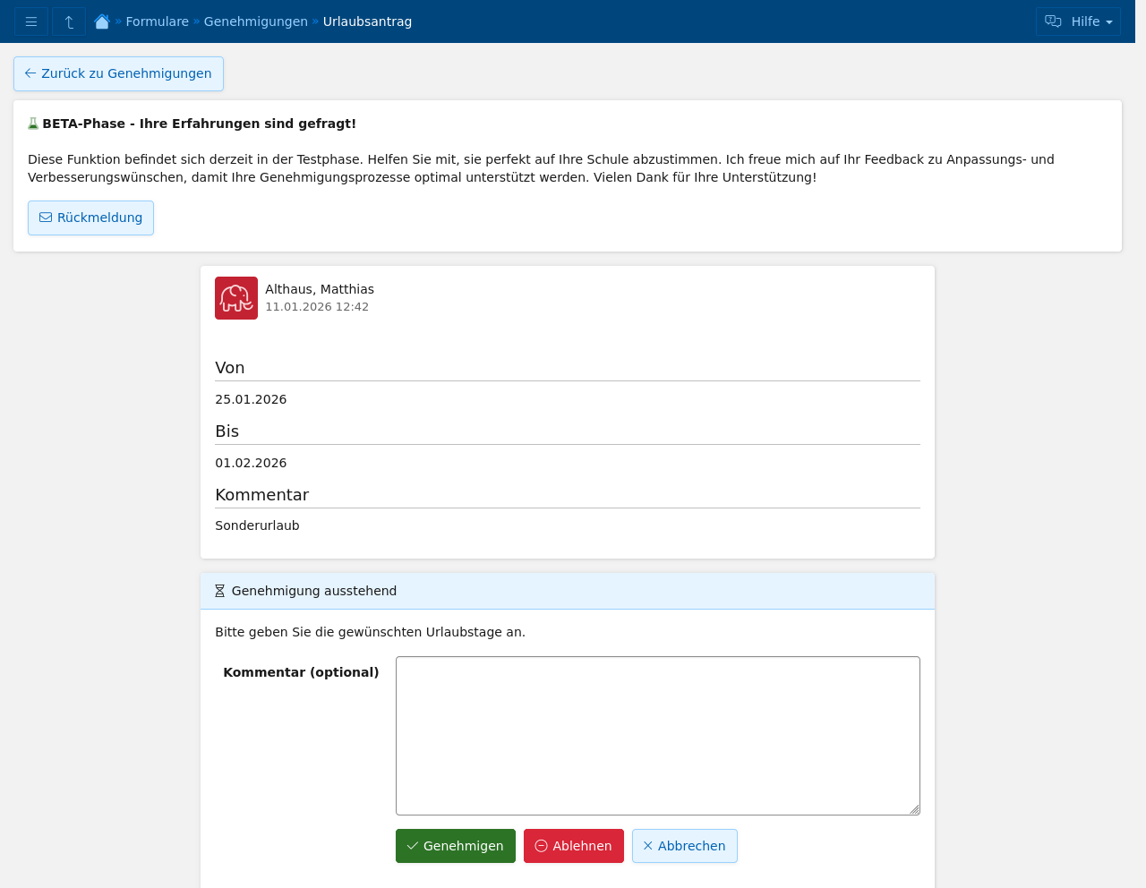 In der Detailansicht sehen Sie den Verlauf des Genehmigungsprozesses und bei laufenden Anträgen ein Formular für Ihre Entscheidung, wenn Sie dafür zuständig sind.