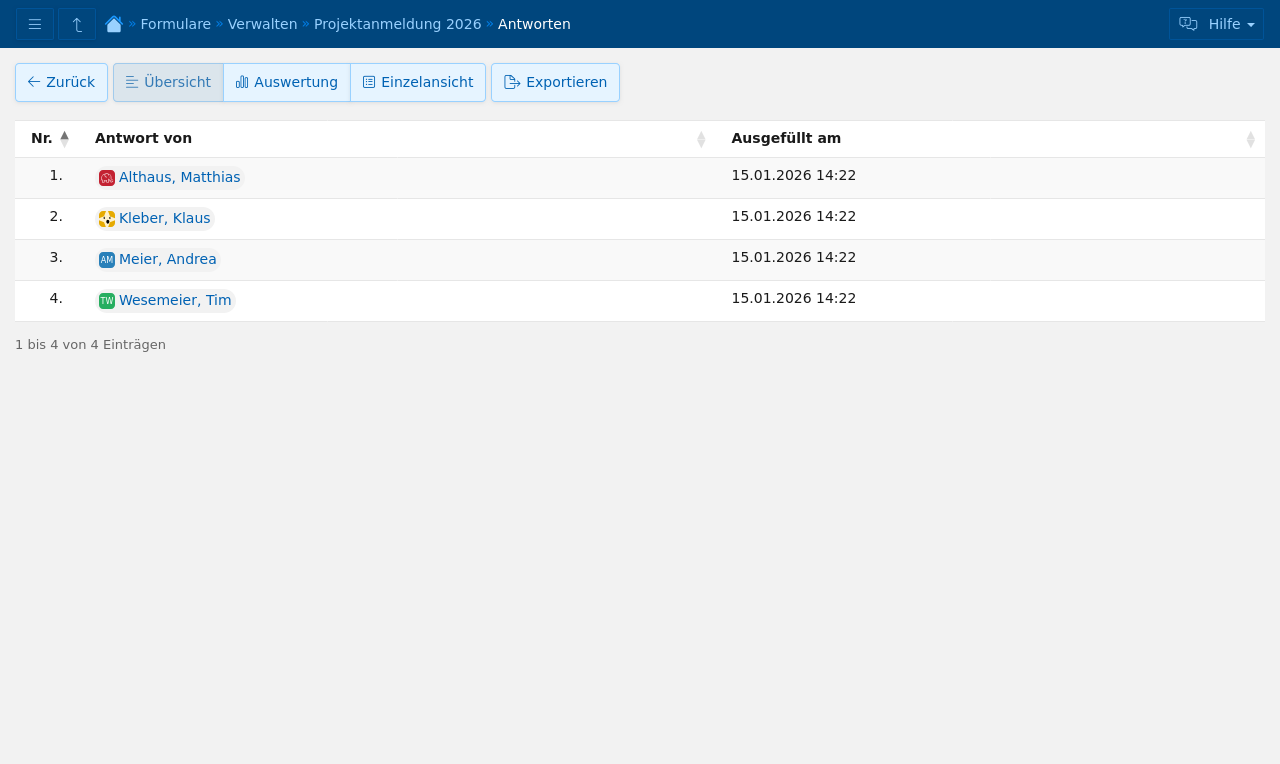 In der Übersicht aller Antworten erhalten Sie einen schnellen Überblick über alle bisherigen Abgaben. Wenn der Name der Teilnehmerin/des Teilnehmers bekannt ist, wird dieser angezeigt.